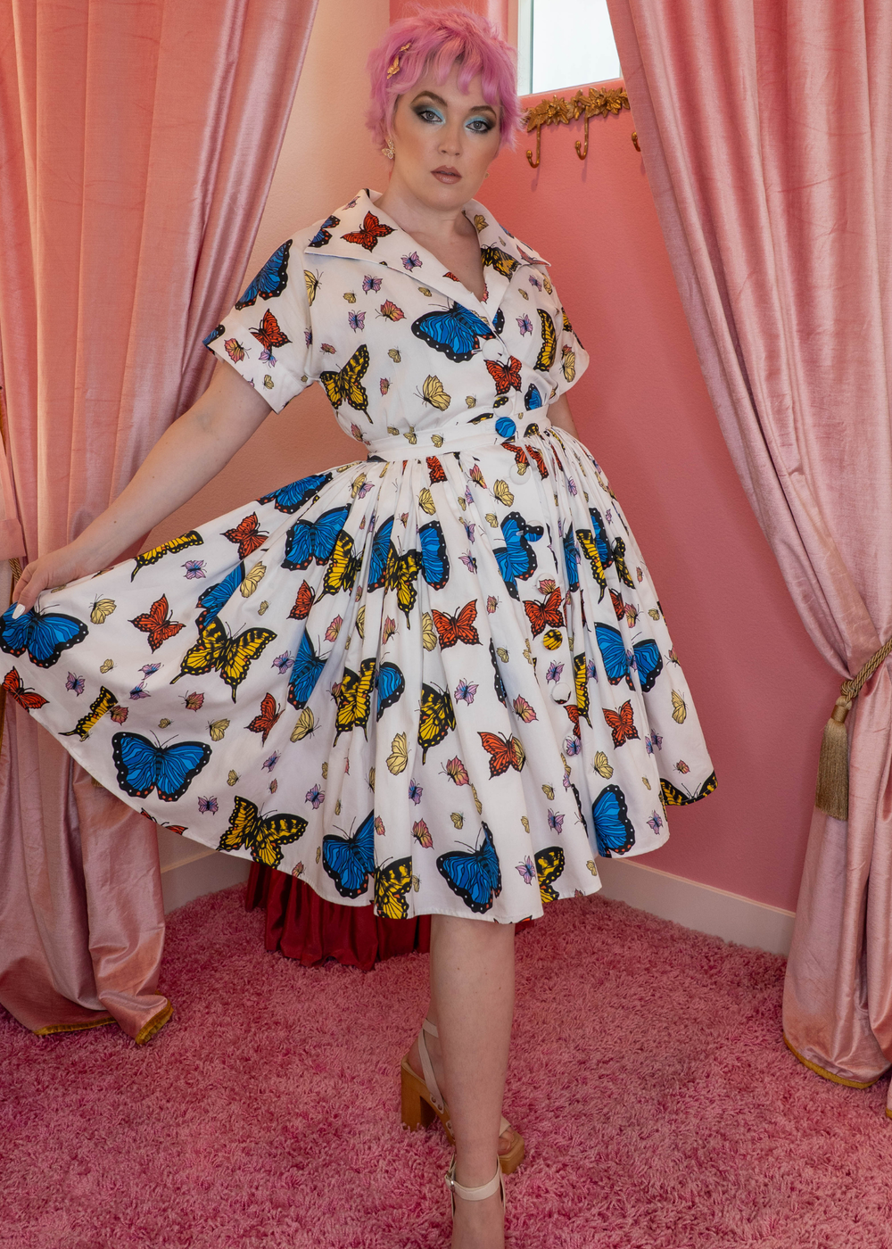 We tailor the majority of garments made to measure in our pink workshop in Sonoma County, California. We even print the fabric to order that goes into the creation of the garment. We sew many of our best sellers to order and complimentary made to measure to ensure that each original design is going to someone that truly LOVES it. We do not produce mass bulk. This is why limited edition collections sell out quickly.