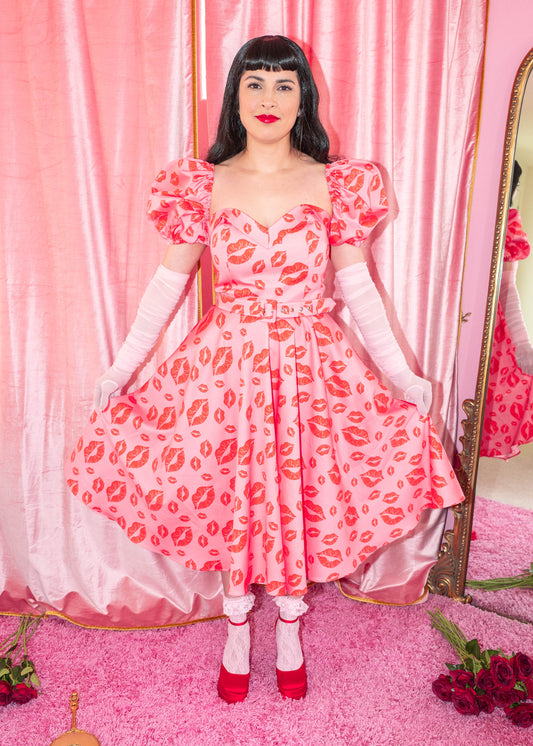 The Marilyn Full Circle Dress - Filakia Kisses Print - Pink & Red