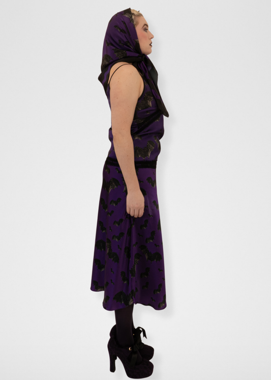 An ode to the nocturnal elegance of Victorian bats, a touch of Victorian purple, and the refined tailoring of 1920s silhouettes.