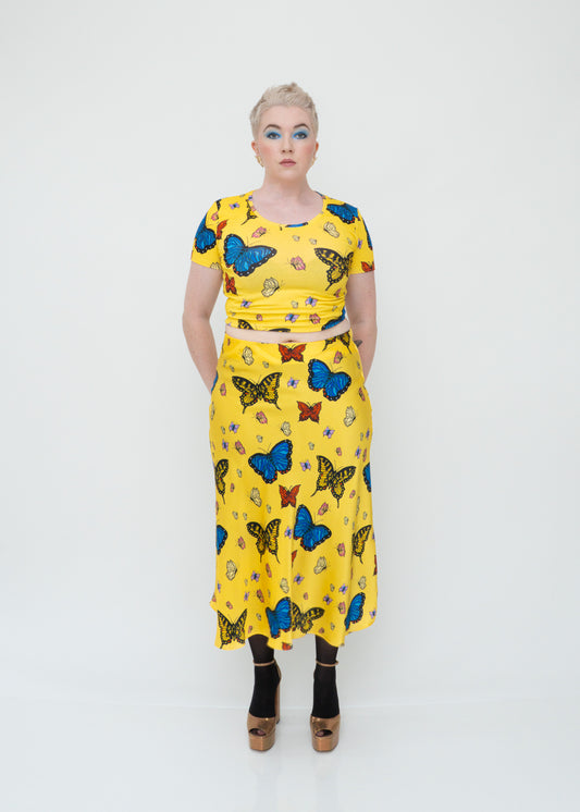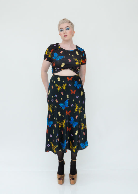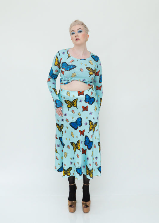 Butterflies Silk Midi Slip Skirt - Sky Blue