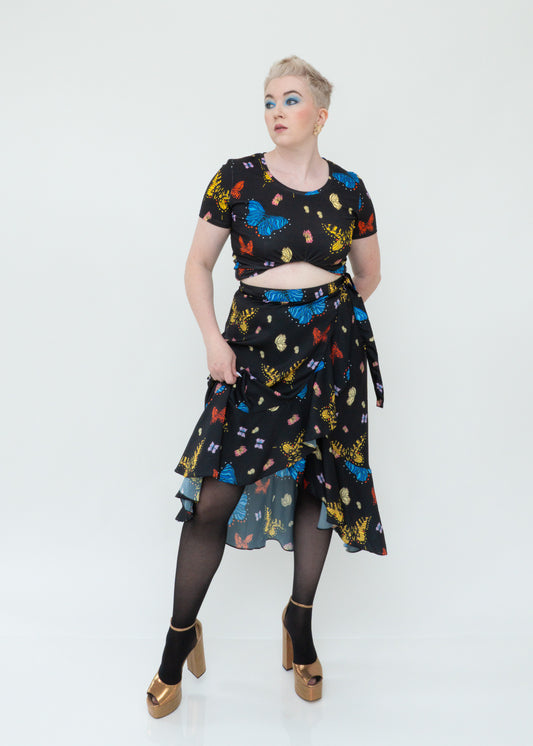 Butterflies Ruffle Midi Wrap Skirt - Black