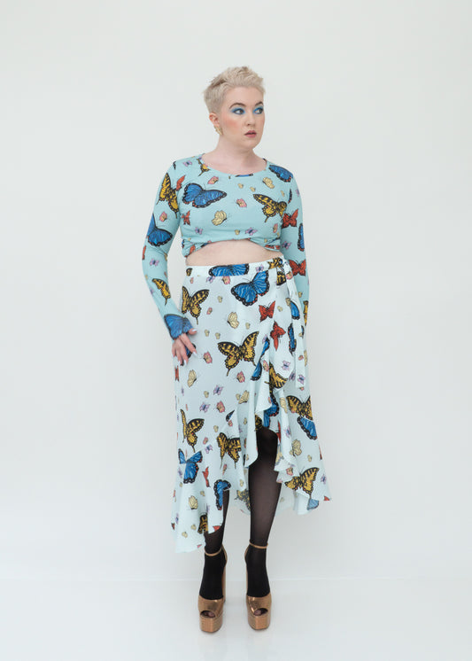 Butterflies Ruffle Midi Wrap Skirt - Pale Blue Sky